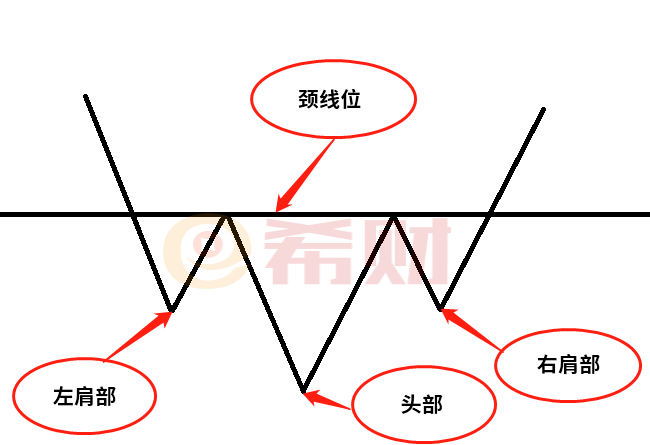 頭肩底是一種股市常見的一種K線組成圖形,跟之前和大家分享到的頭肩頂圖形屬于相反的圖形【】。主要提示市場向好轉折或者個股買點的一種信號圖形之一。頭肩底圖形是由頭部、肩部、頸線位組成。頭部代表市場標的的低點,肩部代表市場標的的第二或者第三高點,頸線位代表兩個或者多個高峰之間的低點平行線。(如下圖所示)