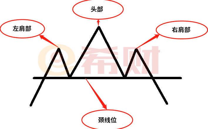 頭肩頂圖形在股市是比較常見的一種圖形,也是一種警示股市指數或者個股下跌風險的一種圖形之一。頭肩頂由頭部、肩部、頸線位組成。頭部代表市場中標的最高位。肩部代表市場中標的第二高點或者第三高點。頸線位代表兩個或者多個高峰之間的低點平行線。(如下圖所示)
