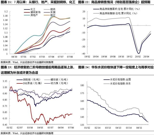 近期周期行業的輪動也存在著一些苗頭。7月1日地產股大漲,隨后7月2日至6日銀行、采掘表現搶眼,而此時建筑裝飾表現一般,化工、鋼鐵則更為弱勢,7月8日鋼鐵、化工反而走強。實際上,地產、銀行、采掘的邏輯與傳統周期品存在一定區別,至少地產銷售數據持續堅挺甚至超預期(2020年6月單月百強房企實現銷售金額14517億元,同比增長13.8%,5月為12.2%,環比增長33.0%)、而銀行和采掘中的不少品種存在高股息支撐,向銀行發放券商牌照也一定程度上提升了銀行關注度。而如果拉長視角看,部分工業品漲價反映的經濟修復在4月、5月最為顯著,而彼時受制于風險偏好多數周期品種并無表現,當前經濟回暖斜率逐漸放緩又可能遇到洪災,此時化工、鋼鐵板塊的上漲可能理解為補漲更為合適。當然6月高頻數據顯示經濟仍在修復之中,也就是說至少Q2數據(7月中旬報出)大概率比較亮麗,這對于低估值周期品構成利好。