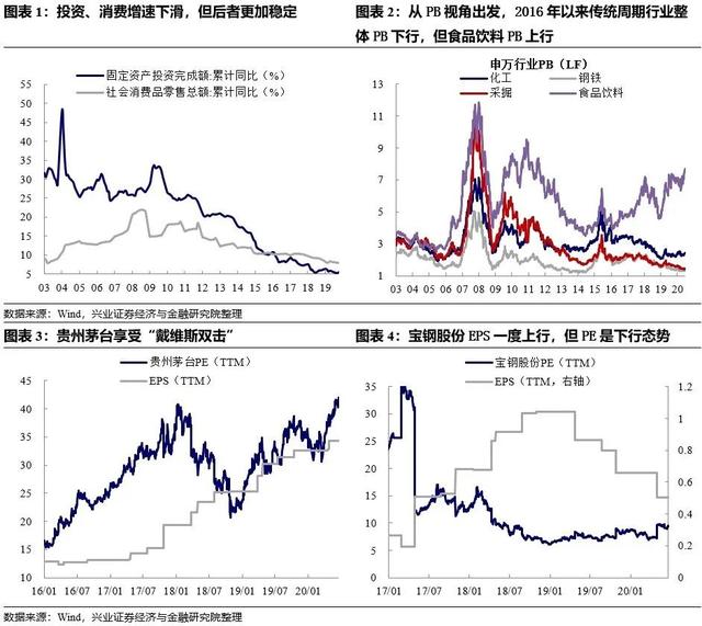 消費類公司估值通常高于周期品種,當前投資者已經習以為常。如果以PB為參照做一個簡單比較,2016年以來食品飲料和傳統周期行業化工、鋼鐵、采掘確實分化愈發明顯,不過在我國經濟高速發展的2003-2007年并非如此。與之對應的是,2007年之前固定資產投資完成額累計同比增速超過25%且社會消費品零售總額同比增速持續爬坡。而自2016年5月后者逐漸超過前者,此時消費品和周期品的估值分化也逐漸開始。