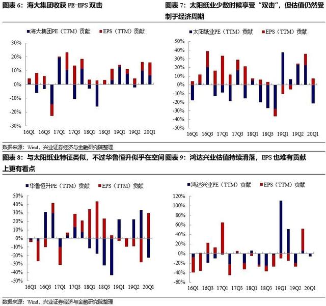 總結來看,2016年以來PE和EPS的組合基本框定了三個周期品種類別,即:1)以海大集團為代表的PE和EPS雙擊;2)以太陽紙業、華魯恒升為典型案例的PE和EPS互相消化,但最終EPS的更大提升帶動股價上漲(反之EPS提升不足以彌補PE下降,則股價也難有大幅上漲,如2016年至今的山鷹紙業和);3)關注度不高的周期品種(如鴻達興業)大多可能是PE和EPS雙殺。