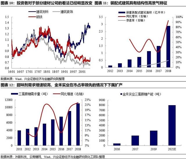 、是我們持續強調的周期品種。相比于政策催化更加明顯的裝配式建筑和新能源汽車,草銨膦和甜味劑雖然能夠看到需求增量的趨勢(前者部分受益于轉基因作物種植和其他除草劑禁用,后者則順應“無糖化”進程),但這可能是個漸進地、包含一些不確定性的過程,體現在投資上則是常說的“成長邏輯還需驗證”。