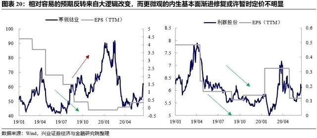 換句話說,估值度量了投資者對于行業空間的預期,既然如此2016年以后傳統周期品股價的核心因素就從PE切換至EPS(可能用PB切換至BPS的表述更好,但是邏輯基本一致,為了與其他行業進行對比我們統一采用“PE切換至EPS”的說法)。兩個相對極端的案例是:1)鋼鐵龍頭自2018年初起估值已是下降趨勢,EPS(TTM)在2018年末達到階段性高點也并不能帶動股價上漲;2)則享受了戴維斯雙擊。