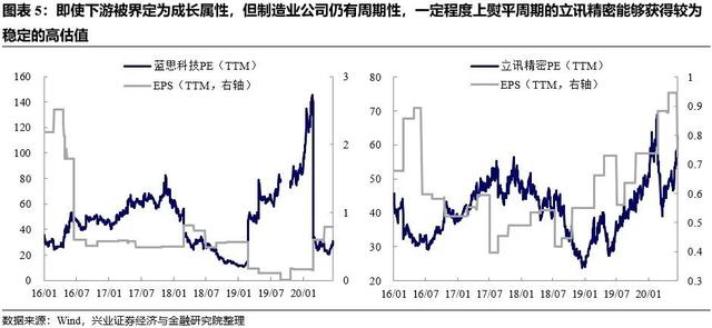 實際上,由于周期意義廣泛(既可以指宏觀經濟周期,也可以是行業周期、政策周期等),周期品的范圍可能也比想象中更大。例如,雖然消費電子行業通常被定義為成長屬性,但其本質則與核心產品的周期相關。從智能手機出貨量來看,2015年至2017Q3是繼2014年同比下滑后的一個小繁榮時段,隨后進入疲軟期,而當期跟隨A股行情和估值均有提升。2018年股市風險偏好下降+智能手機出貨疲軟導致兩家公司估值下殺,而2019年下半年相對2018年的基數效應+5G手機出貨有帶動估值上移。相比于專注于手機外觀防護件的藍思科技,立訊精密的產品已經涉及到耳機、無線充電、汽車電子等,因此能夠一定程度上熨平智能手機的周期,從而獲得較高估值。