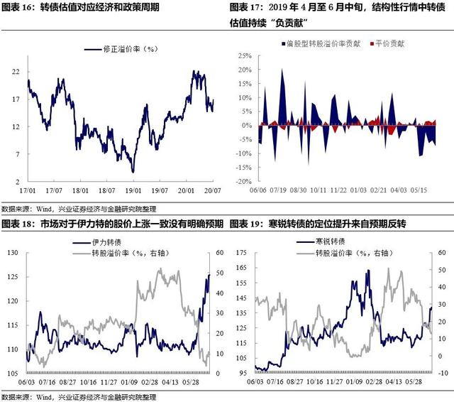 這里還有兩個有趣的討論值得簡述:1)PE和轉股溢價率其實均蘊含了市場情緒因素,或者說,兩者中樞的變化來源于貝塔,而中樞附近的波動來自基本面和股價的阿爾法。2月底前后轉債定位達到過去幾年最高,指向牛市預期的高亢情緒。2)如果以轉債市場而非個券的維度來理解,邏輯也是通順的。“寬貨幣、寬信用”大環境容易帶來股市長牛(2019年6月至2020年2月),因此預期正股賺錢效應的轉股溢價率偏高。但在結構性行情下(2020年3月至今)大貝塔品種幾無收益,在流動性變化不大的情況下轉債估值分化也能看到(我們在《勿因定位遮望眼_20200426》中有過詳細論述)。
