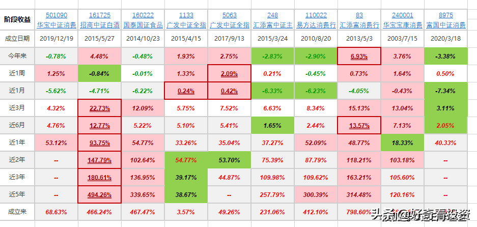 消費指數基金,歷史業績中越是偏重持倉白酒和食品飲料,業績越好,說白了都是靠白酒的業績支撐。可選消費相對表現較弱,但是可以和主要消費進行優勢互補,短期主要消費調整時,可選消費表現可能會不錯。
