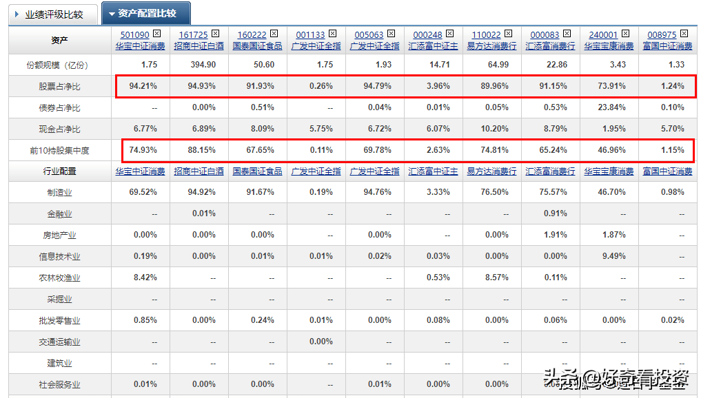 另外作為對比的三只消費主動基金,分別代表著不同的持倉風格: