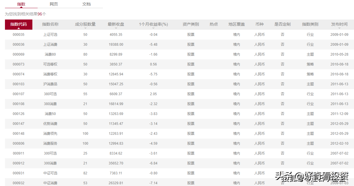 從中證指數公司官方網站查詢,我們可以得知目前“消費類”指數總共有96個,“食品類”指數12個……。我們再從國證指數公司官方網站查詢,我們可以得知目前“消費類”指數總共有48個,“食品類”指數18只……。當然兩個網站還有很多其他消費細分行業指數,所以消費類指數數量是非常的多,甚至可達數百個指數。