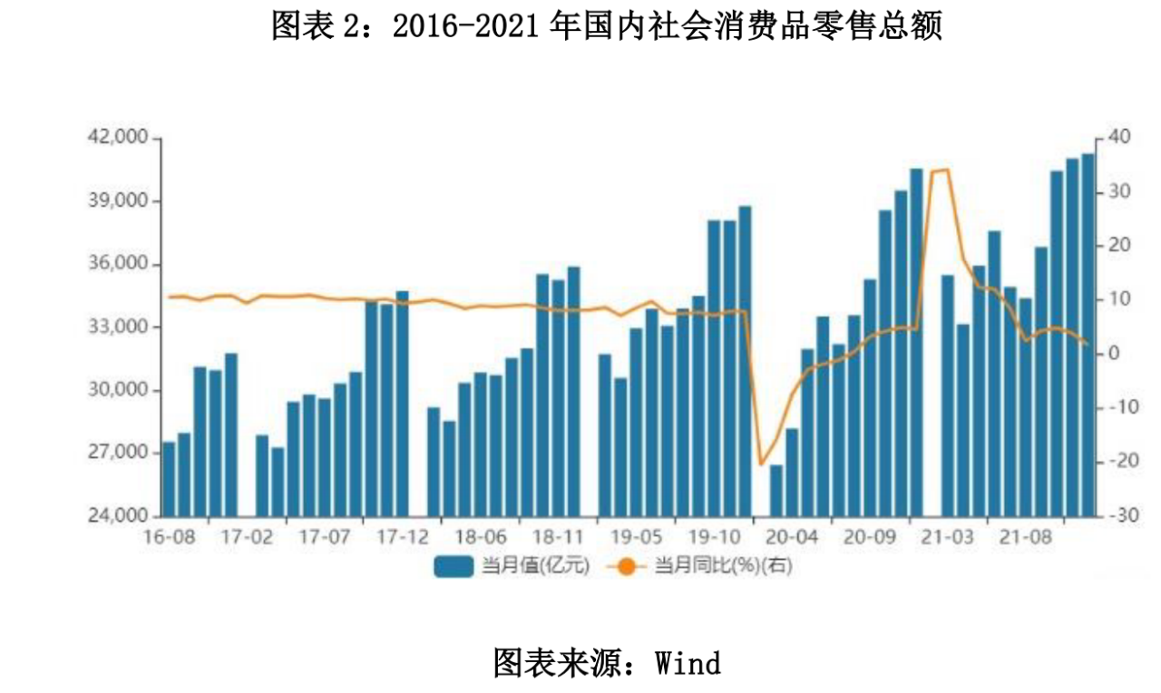 2021年12月,社會消費品零售總額為41268.9億元,環比增長0.55個百分點,同比增長1.73個百分點。