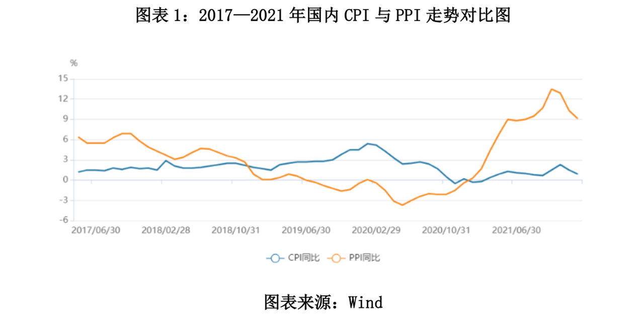 圖表1:2017—2021年國內CPI與PPI走勢對比圖