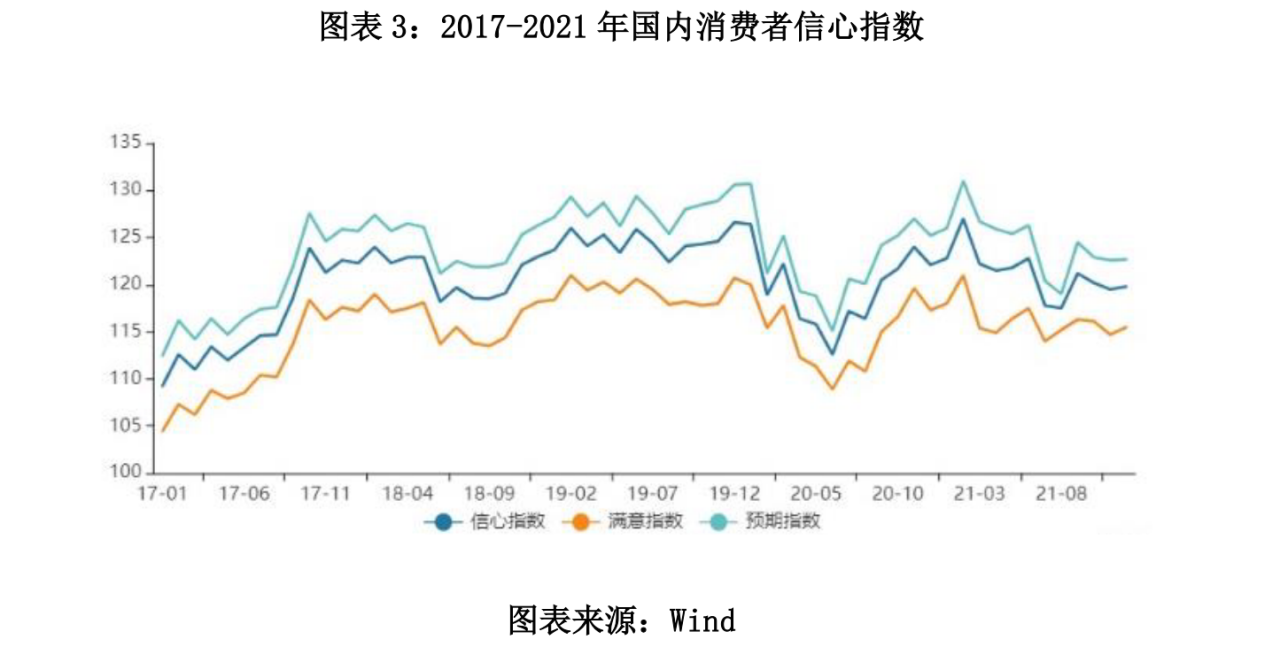 雖然社會消費品零售總額有所提升,但消費者信心指數在2021年則處于震蕩下行狀態。