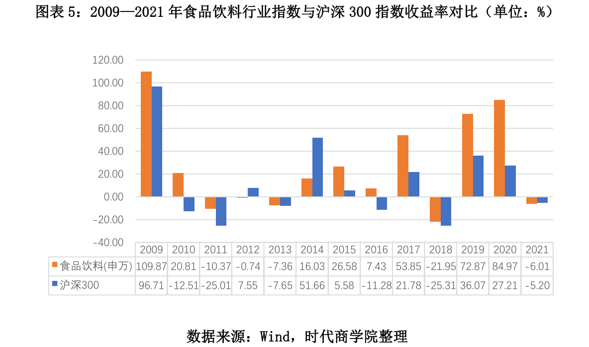 圖表5:2009—2021年食品飲料行業指數與滬深300指數收益率對比(單位:%)