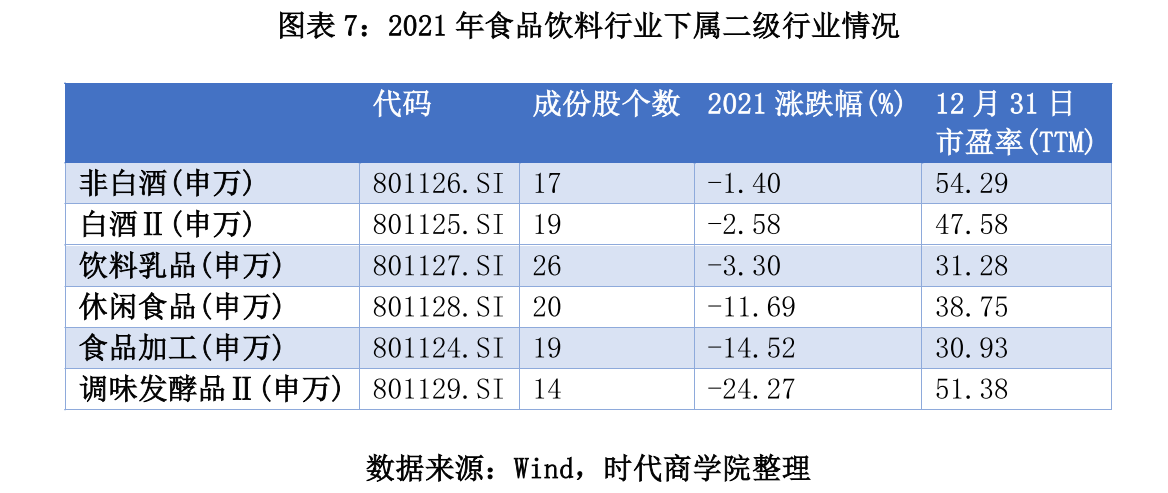 與此同時,2021年,上述三個行業指數也較為抗跌,跌幅分別為-2.58%、-3.30%、-1.40%,低于食品飲料行業的整體跌幅(-6.01%)。