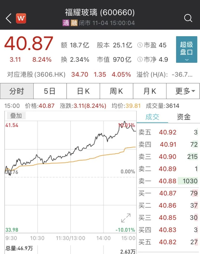 福耀玻璃(600660)盤中一度漲停,收盤漲8.24%,股價再創歷史新高。另外福耀玻璃(3606.HK)港股表現也十分可觀,收盤漲4.65%,報34.85%,最新總市值為1127億港元。