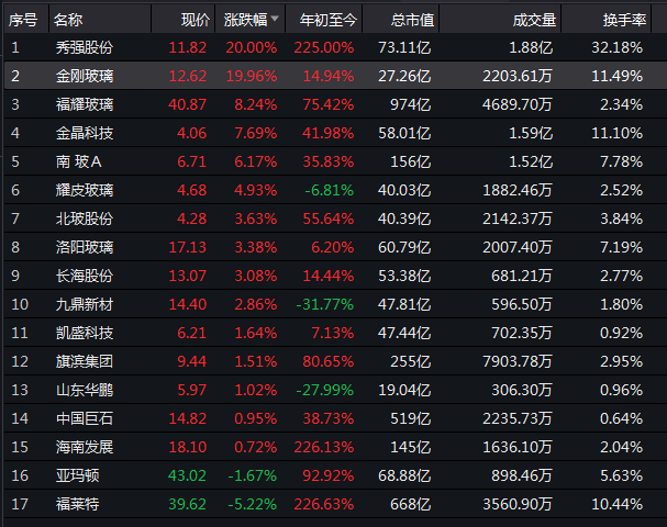 具體來看,、玻璃紛紛漲停,大漲20%領漲整個板塊。另外、金晶玻璃、南玻A等今日均漲超5%。