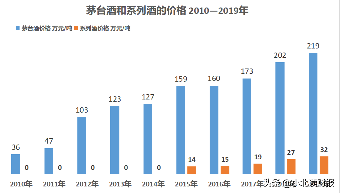 茅臺酒每噸價格從2010年的36萬元提升到2019年的219萬元,年均復合增長22.4%;
