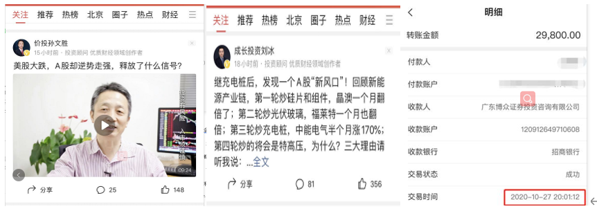 今日頭條上還有個比較流行的套路,就是發某個行業,板塊或概念的評估視頻,然后讓你發私信索取相關資料。你發私信后就會讓你加他們助手的微信,然后拉你進一個學習群,有老師天天發收盤和第二天預測分析,偶爾會發標的帶你玩,這種剛剛發的標的質量還是可以的,至少不會讓你虧很多。再過上十天半個月,專家助手就會曬出股民購買他們服務的貼圖了,29800一年的服務費,一個一百來人的群一天有十來個人付費……我就在群里默默的待著,主要是想看看他們選股的思路,實話我沒買過他們推薦的股票,如下圖是博眾證券資訊公司,其實頭條上有很多活躍的專家都是這個公司的。