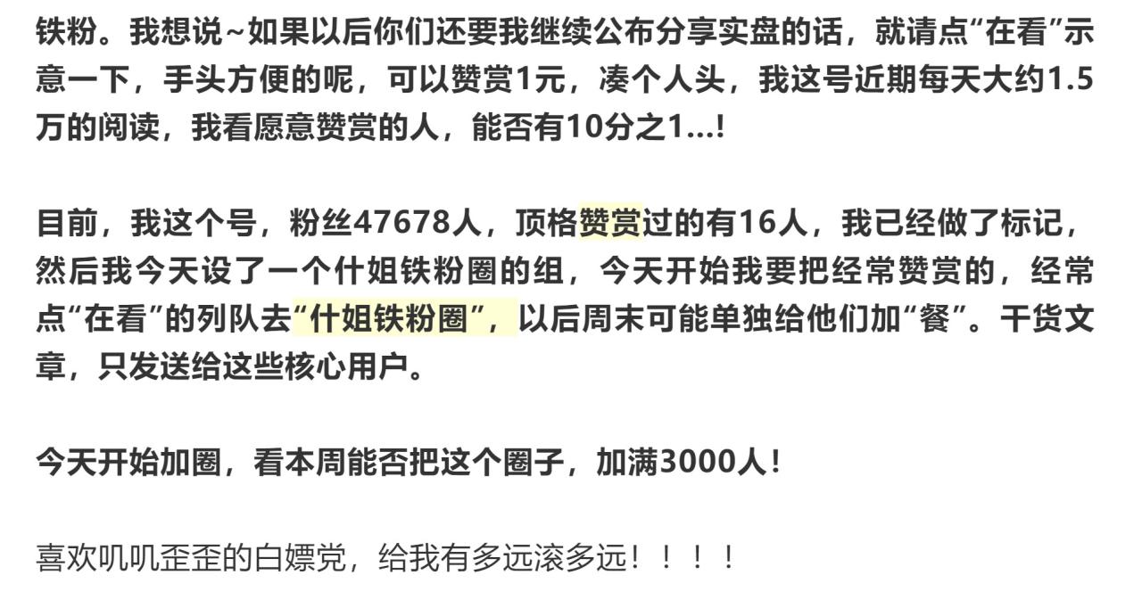 流量專家就是指那些全靠發文,發視頻指導其他人進攻撤退的人,這些人主要是賺流量錢的,靠平臺收益,靠粉絲打賞。有些專家會一個月或選擇某天邀賞,有的是每天都開打賞,部分專家可能還會嫌棄打賞的太少,話里話外嘲笑諷刺,比如為知識付費,什么白嫖,典型的韭菜,認知不夠……感覺你不打賞不止是欠了人情,還是低智低能,活該成為韭菜。我贊成知識付費,但對這種類型的博主從沒贊賞過。一是我沒買過他們推薦的票,算不上白嫖,二打賞是來自粉絲的愛,對這類博主我并不愛。比如下面這些話: