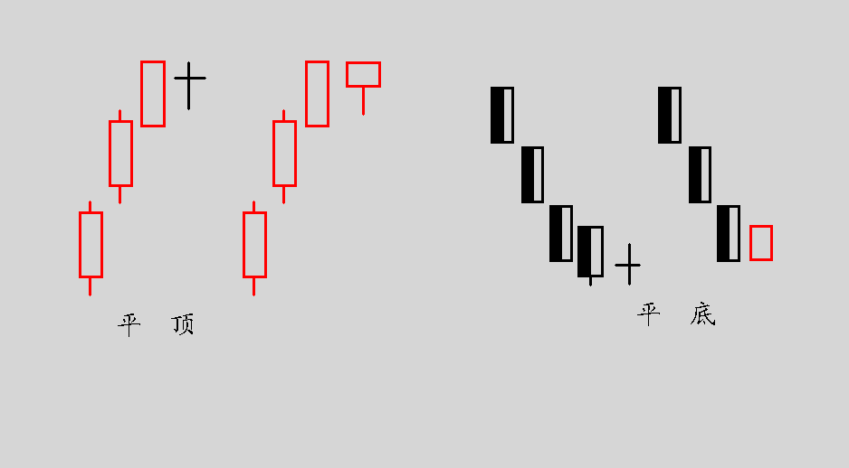 六、平頂與平底:在上升的末期出現同價的頂部,其后下跌的可能性較大,在下跌的初期出現同價的底部,其后上升的可能性較大。