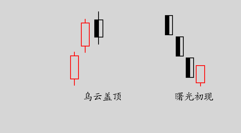 烏云蓋頂是由一根陽線與一根陰線組成,第二根陰線深入第一根陽線實體中一半以上,第二根K線收盤價越低,開始時成交量越大,并在開盤初期曾明顯越過阻力區后回頭下跌,見頂回落的趨勢就會越明顯。曙光初現與烏云蓋頂相對,往往預示行情反轉上升,是買入的時機。
