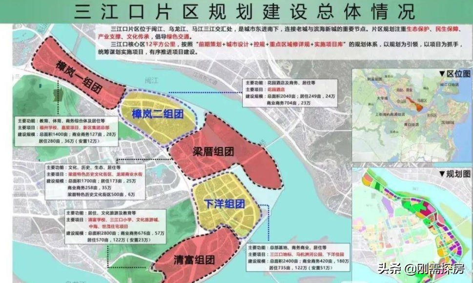 三江口:福州前幾年開發的板塊,作為東進南下的橋梁,被泰禾拖累了一段時間,目前區域也劃片了幾個片區,樟嵐區域靠著清華附中做到了較高去化,梁厝主打雙地鐵交匯站,清富片區目前最慘淡,滯銷嚴重。對于板塊而言,雖然也規劃了不少市政配建項目,但是從整體規劃看,更像是被定位成福州的接待中心,未來區域的城市界面可能會不錯,但是留住人口的動力目前并不大。