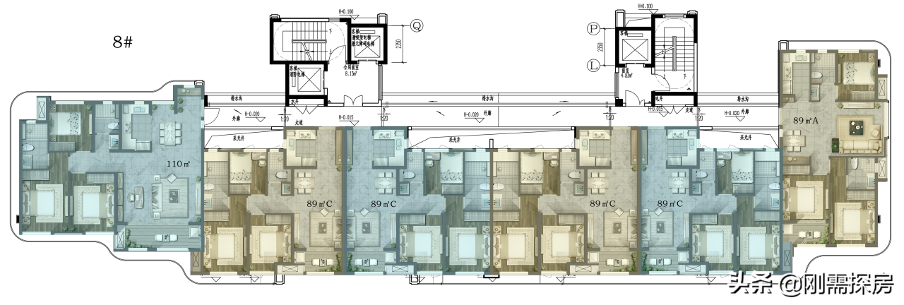 對比市區的板塊而言,低于80以下戶型樓盤并不算多,大部分連廊產品基本以端頭110-125,中戶89-99為主,個別設計130以上的兩梯兩戶小高層。