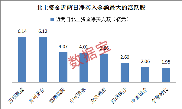 從兩日累計流入情況來看,北上資金連續兩日流入和貴州茅臺金額最高,分別為6.14億元和6.12億元。