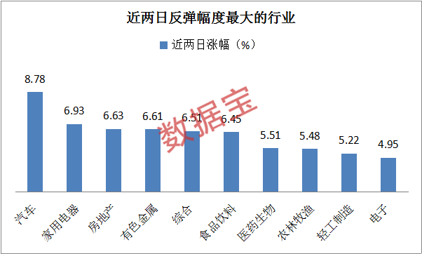 行業方面,28個申萬一級行業指數連續兩天全線飄紅,汽車行業指數近兩日上漲8.78%,領跑兩市,、力帆股份、等個股今日強勢漲停。家用電器、房地產、有色金屬、綜合和食品飲料行業近兩日累計漲超6%,反彈幅度居前。鋼鐵、公用事業行業反彈幅度較弱,近兩日累計漲幅不超過3%。