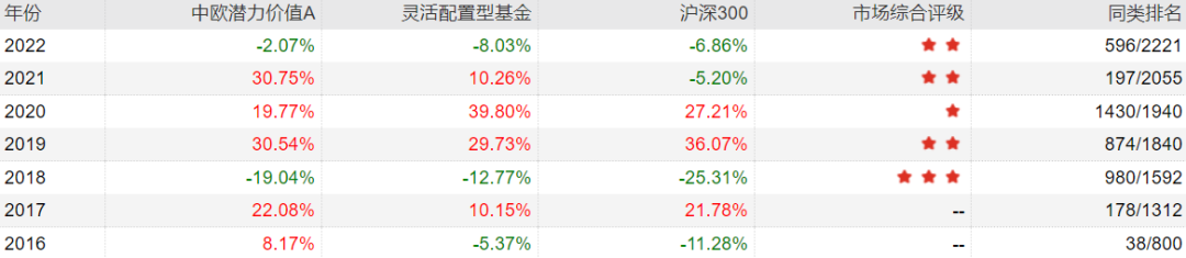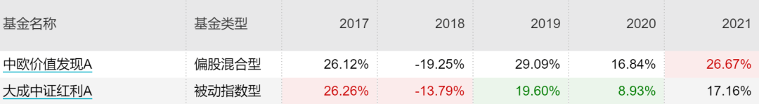 中歐價值發現以低估值為核心的策略,大多年份都成功跑贏了中證紅利,在21年實現了26.67%的收益率,而大多大盤成長風格基金在2021年是負收益。