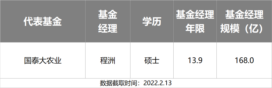 程洲碩士學歷,CFA,是一位有21年的從業經歷,基金管理近14年的老將,代表基是國泰聚信價值優勢,這只農業基也是由他一手管理至今。
