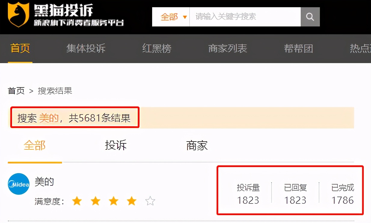 對于家用電器,消費者更加關心的是質量問題,但美的集團的產品的投訴量高企。在黑貓投訴平臺,搜索關鍵詞“美的”就出現了5681條數據,投訴量也高達1823條,反觀,僅有1485條搜索結果,投訴量為1032條,投訴量較美的集團少了近800條數據。