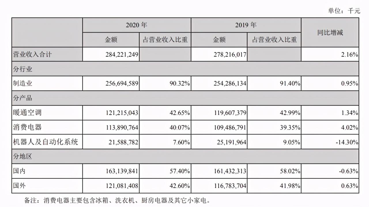 從產品來看,美的集團主要包括暖通空調、消費電器(含冰箱、洗衣機、廚房電器及其它小家電)、機器人及自動化系統,在2020年的營業收入分別為1212.15億元、1138.9億元、215.89億元,占營業收入的比重分別為42.65%、40.07%、7.60%。
