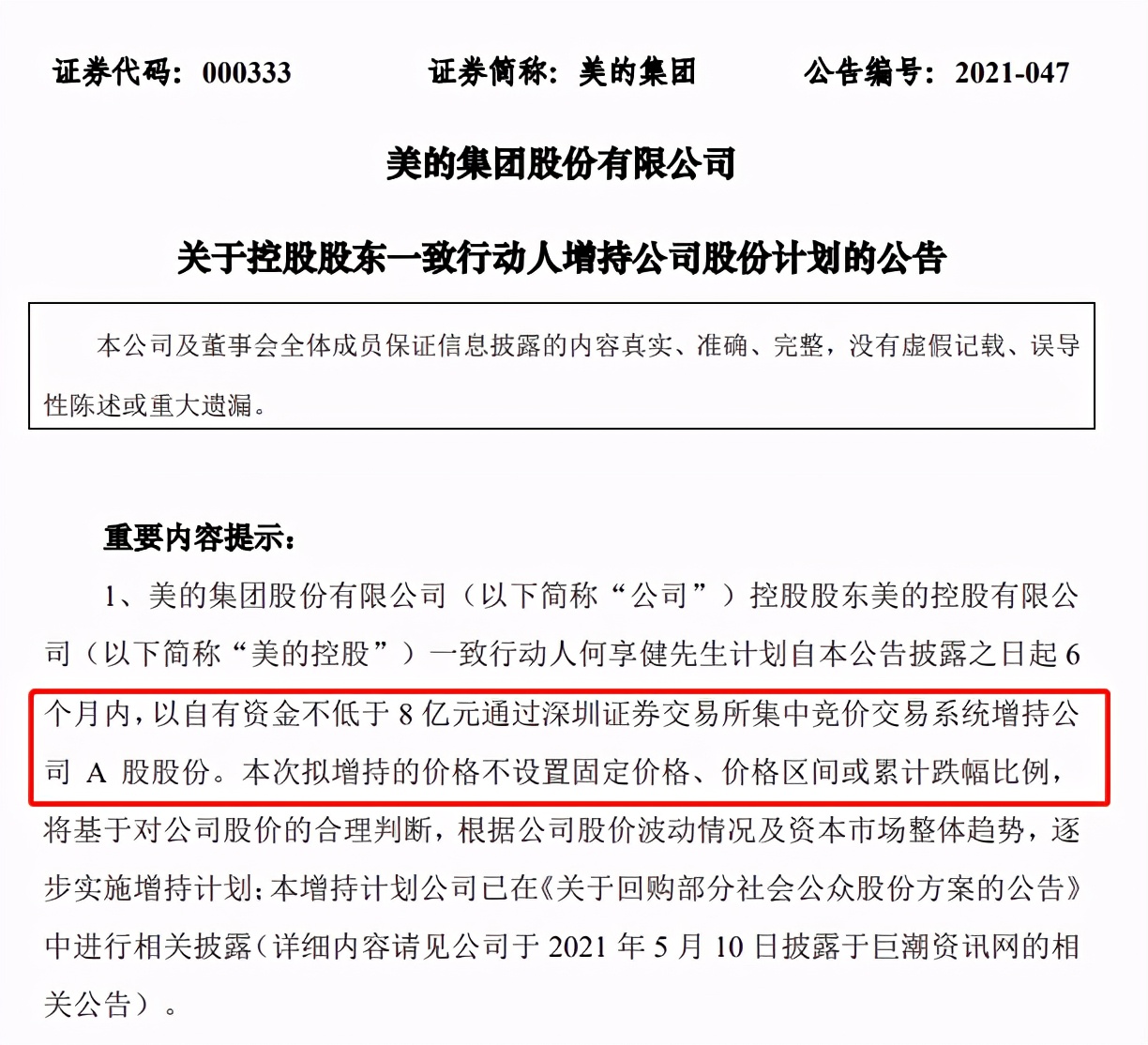 除了回購之外,美的集團的創始人、實際控制人何享健也發布了增持計劃。5月22日,何享健計劃在未來半年內,以集中競價交易方式增持美的集團股份,預計資金不低于8億元,沒有限定股價區間。