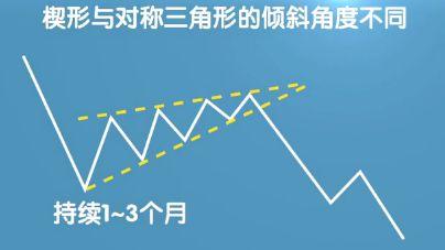 與對稱的傾斜角度不同,這是它們之間最顯著的區別,楔形也是由兩條逐漸聚攏的趨勢線構成,它通常持續的時間在1~3個月,與三角形同屬中等規模的走勢形態。