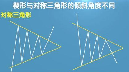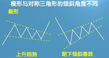 我們知道對稱三角形是沒有傾向性的,在上升趨勢中出現的對稱三角形和下降趨勢中出現的對稱三角形,在外觀與規模上并無二致,但楔形卻具有明顯的傾向性。