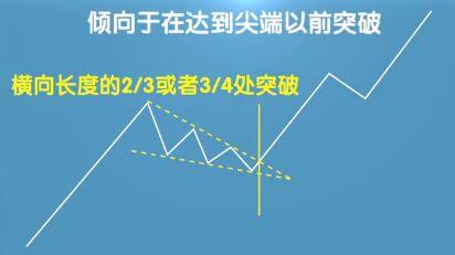 與對稱三角形的突破相近似,楔形的突破也一般發生在其橫向長度三分之二到四分之三處,直到楔形尖端才發生突破的情況較少,楔形更傾向于在達到尖端以前發生突破。