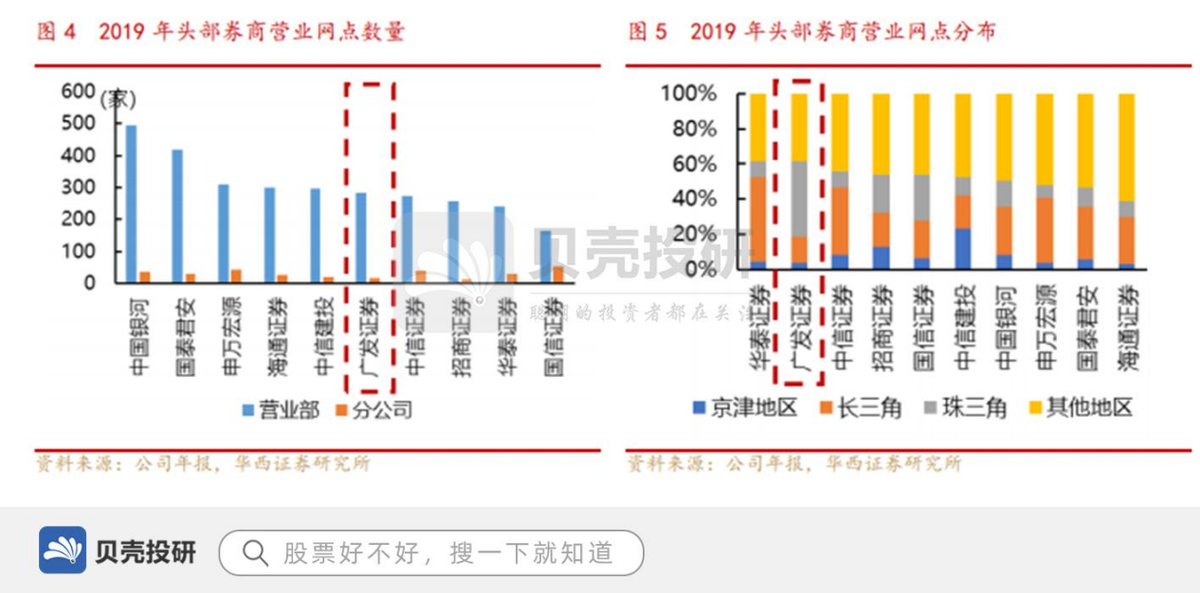 截至2020年末,公司共有分公司20家、證券營業部282家,分布于全國31個省、直轄市、自治區。廣發證券的營業網點和分公司數量排名較為靠前,同時從營業網點地理分布上看,廣發證券處于珠三角地區的營業網點比例明顯高于其他券商,整體處于京津地區、長三角和珠三角三大經濟發達地區的營業網點占比與接近,居于同業領先地位。