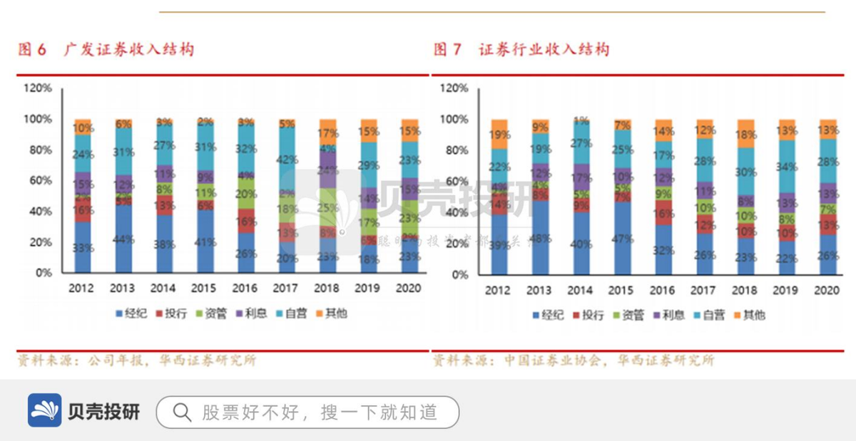近年來伴隨傭金費率下滑,經紀業務收入在總收入中占比大幅下滑,從2015年年之前的40%左右下滑至近三年的20%左右。與行業相比,廣發證券經紀業務占比稍低,2019年占比18%,2020年伴隨市場股基成交額的大幅提升與公司投行業務的暫停,占比提升至23%。