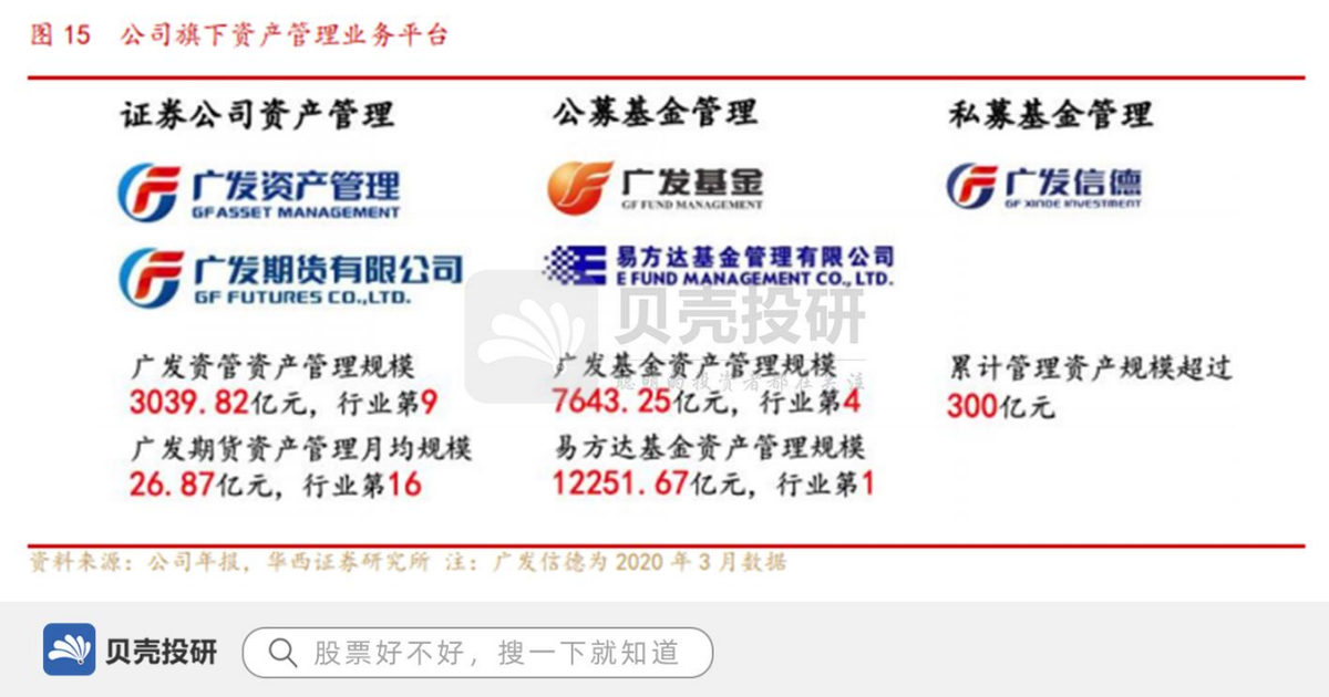廣發證券的投資管理業務主要包括資產管理業務、公募基金管理業務及私募基金管理業務。資產管理業務以及公募基金管理業務具備較強優勢,2020年,廣發資管規模3039.8億元,行業排名第9;控股的廣發基金管理規模7643.2億元,行業排名第4;參股的易方達基金管理規模1.23萬億元,行業排名第1。