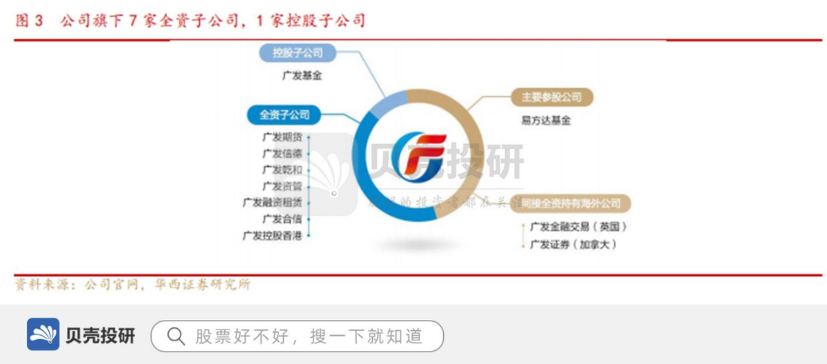 公司旗下目前有7家全資子公司,1家控股子公司,1家主要參股公司和2家間接全資持有海外公司。全資子公司分別是廣發期貨、廣發控股(香港)、廣發信德投資、廣發乾和投資、廣發合信產業投資、廣發融資租賃(廣東)和廣發證券資產管理(廣東),控股廣發基金,持股易方達基金,間接全資持有廣發金融交易(英國)和廣發證券(加拿大),形成了以證券業務為核心、業務跨越境內外的金融控股集團架構。