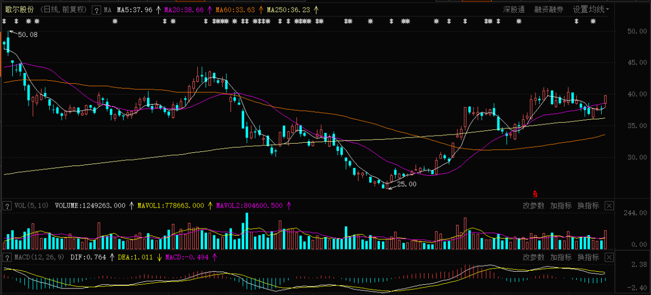 歌爾股份VR、AR產品一直供不應求,一季度業績翻2倍,中報業績有望持續爆發,趨勢上股價剛確認了年線的有效支撐并反彈。