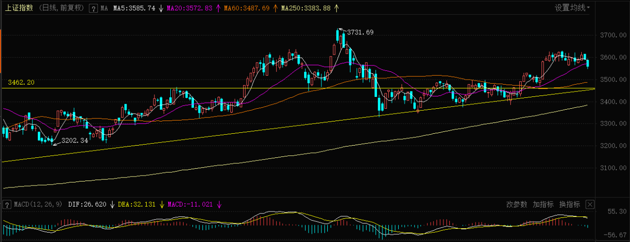 今天三大指數都綠了,盤面上板塊跌多漲少,不過兩市的成交額再次突破了一萬億水平,有色、鋼鐵領跌,北上資金也凈賣出了51.54億元。從趨勢上來看,指數今天踩破了20日均線,MACD等指數也是死叉向下,預示可能還有調整。