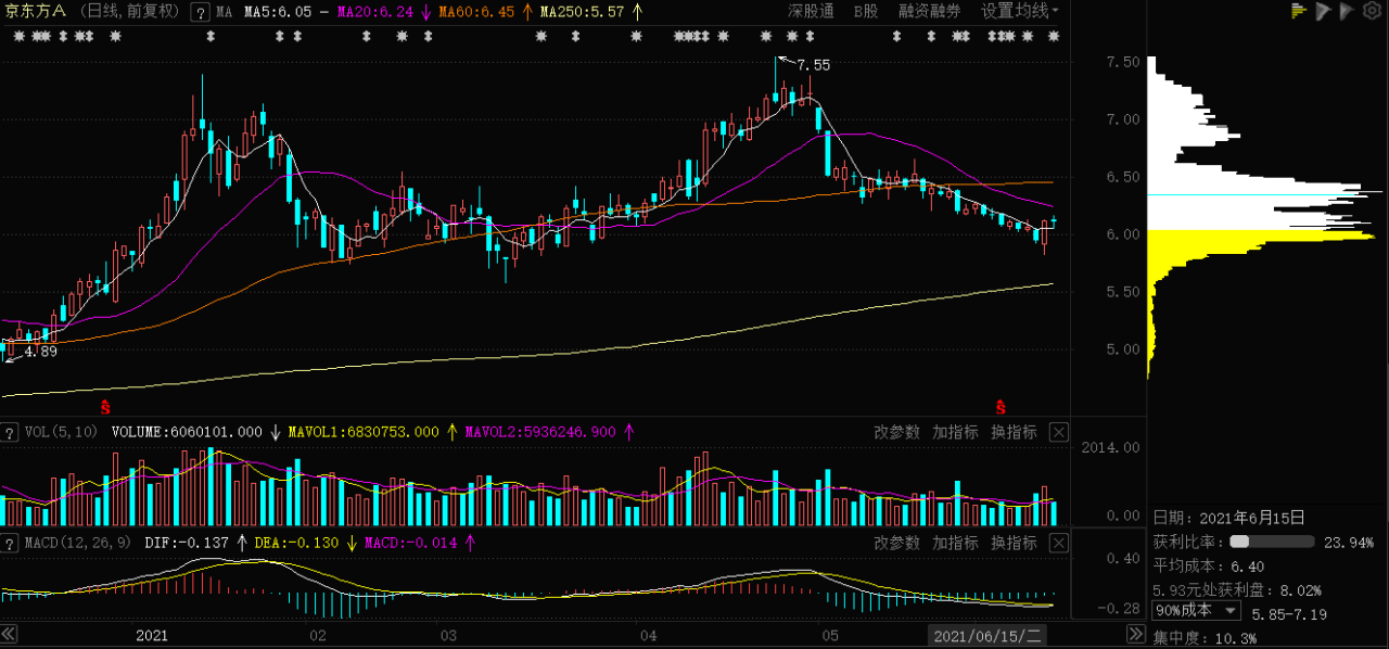 京東方A剛剛經歷大跌洗盤,股價正在年線附近出現明顯止跌現象,低位籌碼集結,值得一看。