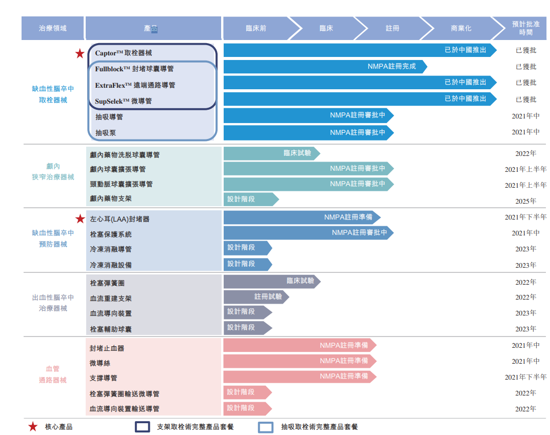 從產品來看,心瑋醫療目前擁有三款商業化產品以及19款在研產品,覆蓋了神經介入領域的所有主要腦卒中亞型及手術路徑。從時間來看,心瑋醫療計劃在2021年一共推出九款新產品,2022年與2023年每年將推出四款新產品。