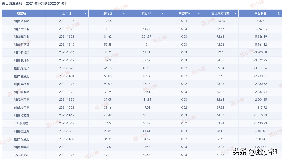 2021年,A股新股首日破發列表
