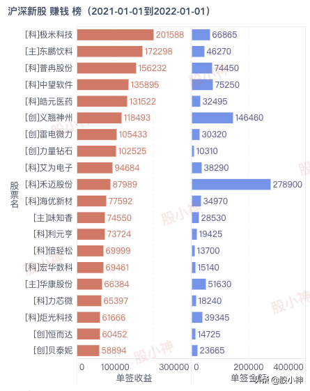 2021年,A股滬深新股賺錢榜