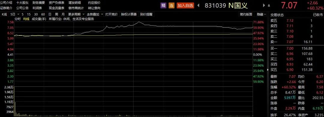 國義招標今日正式掛牌精選層,首日表現相當耀眼,大幅高開后震蕩走高,午后最高觸及7.58元,最終收報7.07元,較其發行價格4.41元大漲60.32%。該股全天換手率為26.47%。