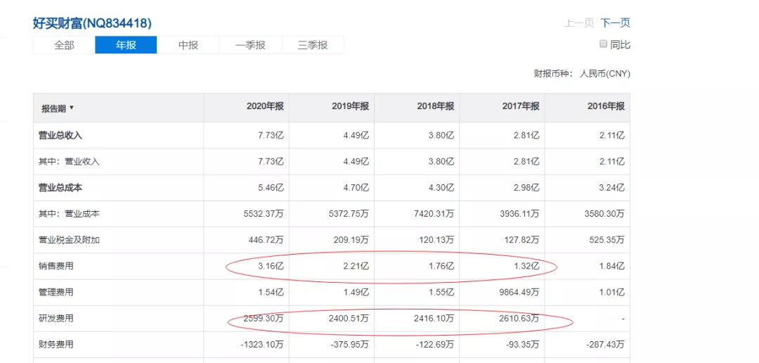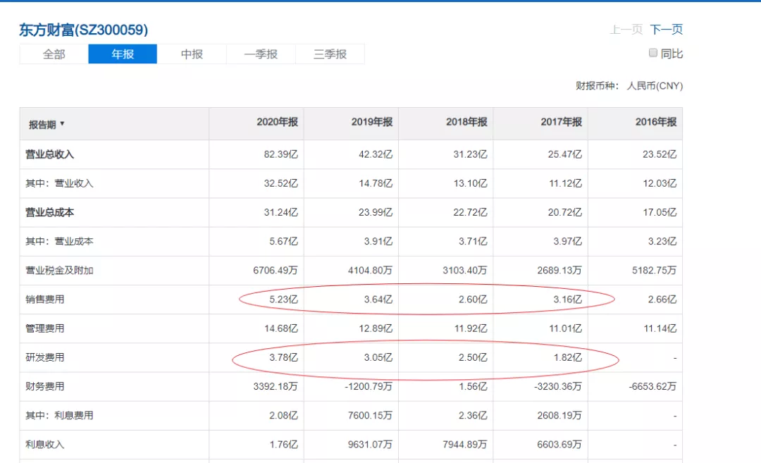 而東方財富研發人員占比近 40%,研發投入逐年提升,2020 年達到 3.78 億元,銷售費用5.23億,相差不大。