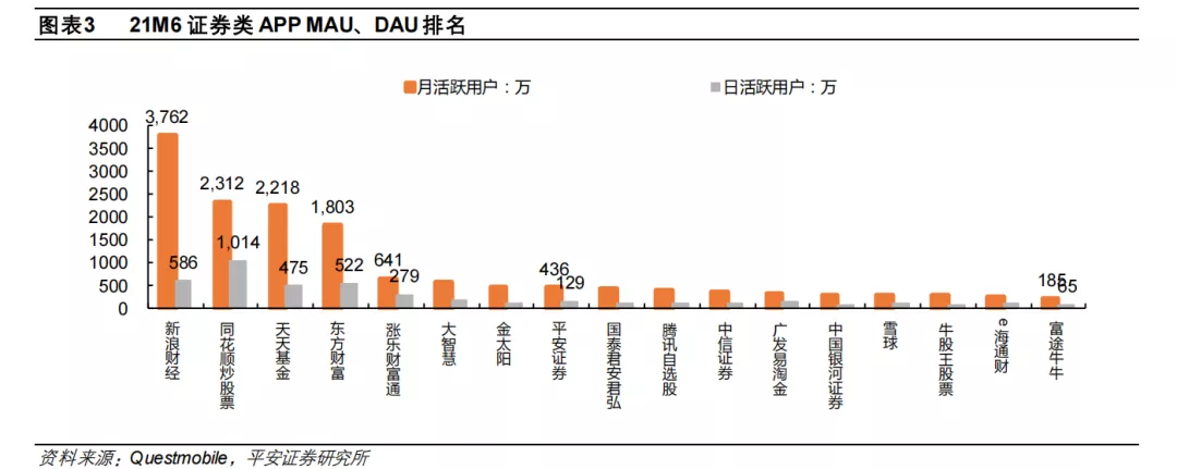 根據 WIND 數據,2021 年 4 月,東方財富網、天天基金網月活用戶分別為 1462 萬和 519萬,在證券類 app 中名列前茅。