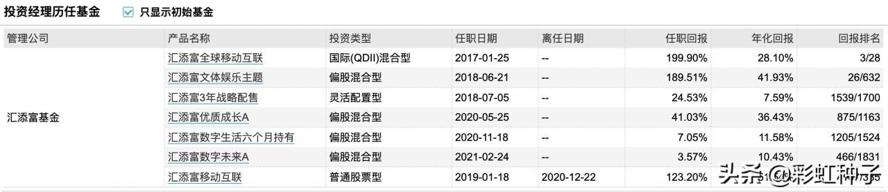 所以,我們需要找一只主要投資A股和港股的基金來做分析——匯添富文體娛樂主題 ( 004424.OF ),這只基金從名字大家也能夠看出來了,這是一只有點偏向于消費的主題性基金,還不是全行業選股的基金,從2018年6月21日至今,累計收益率189.51%,年化收益率41.84%。業績表現同樣非常優秀。(數據來源:WIND,截止2021.07.02)